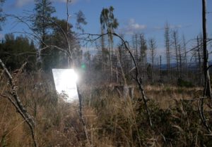 Bezugspunkt der Arbeit ist der großflächige Verlust von Wäldern im Harz und die damit verbundene Transformation des lokalen Ökosystems. Die Tonaufnahmen sind im Oberharz bei Schierke 2023/24 entstanden. Mittels spezieller Kontaktmikrofone werden die Klänge innerhalb der Stämme hörbar. Wie klingt eine sich wandelnde Landschab? Welche Stimmen tragen nichtmenschliche Akteure in sich? Die Installation widmet sich akustisch der Transformation des Harzes – einer Region, in der das großflächige Sterben der Fichten ein neues, unheimliches Klang- und Bildarchiv geschaffen hat. Ausgangspunkt der Installation sind Tonaufnahmen aus dem Inneren abgestorbener Bäume, aufgenommen im Oberharz bei Schierke (2023/24). Diese Klänge – das Knacken, Knistern und Arbeiten des trockenen Holzes – werden in Lichtsignale und elektrische Impulse übersetzt. Die hölzernen Elemente – Regalteile und Bauelemente der Möbelindustrie werden zu Resonanzkörpern eines Ökosystems, das sich transformiert. Sie verweisen auf komplexe Zusammenhänge aus Nutzung, Bewirtschabung und Ausbeutung, denen Wälder seit Jahrhunderten unterworfen sind. Die amorphe Klänge und das Leuchten der Glühlampen korrespondiert mit der komplexen, ob ungreifbaren Vernetzung ökologischer Prozesse. Udo Koloska forscht an der Schnittstelle von Soundart, Ökologie und spekulativer Ästheik. Die Installation ist Teil einer Reihe, die ausgehend vom Tonmaterial jeweils site-spezifisch neu entwickelt wird. Sie war schon in unterschiedlichen Versionen in Potsdam, Leipzig und letztens in der Elektro- Schaltwarte in Berlin Prenzlauer Berg zu sehen.
